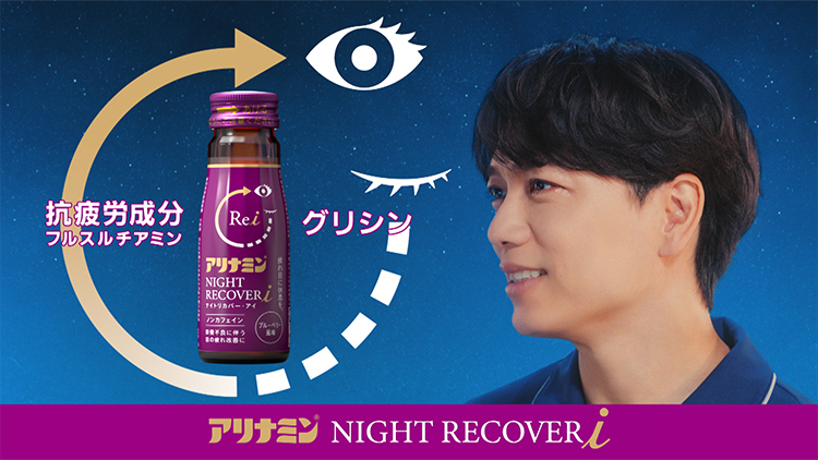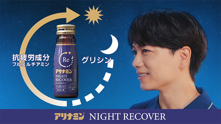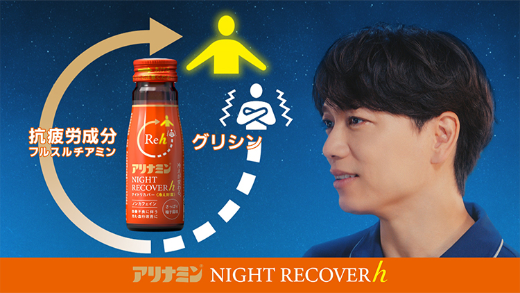 TVCMでは、山崎育三郎さんが、からだの疲れ⽤、疲れ⽬ケア⽤、冷え対策⽤と、お悩みに応じた3タイプのアリナミンナイトリカバーを紹介します。
