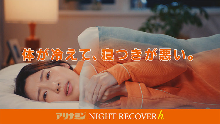 体が冷えて、寝つきが悪いと悩む女性に、アリナミンナイトリカバーhをすすめる山崎さん。女性がアリナミンナイトリカバーhを飲んで、寝て、回復する様子を描いています。