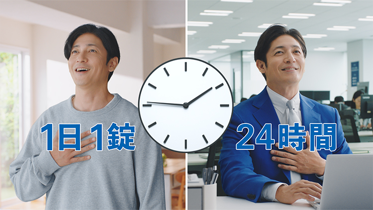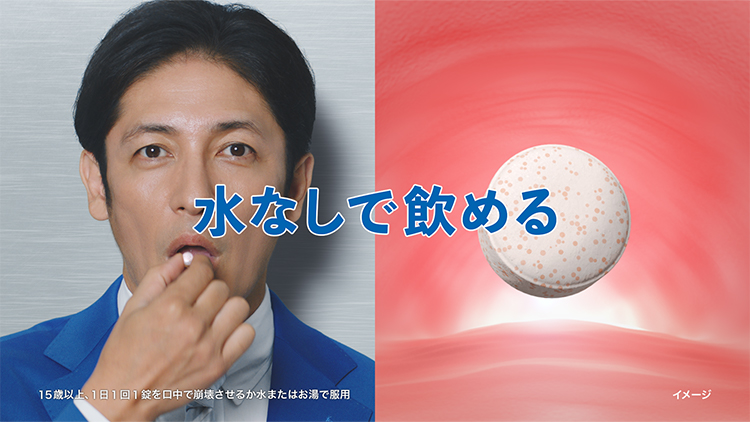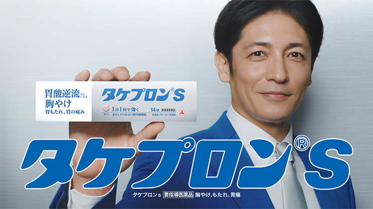 タケプロンsのパッケージをモチーフにした背景から、自信に満ちた表情で玉木さんが登場。