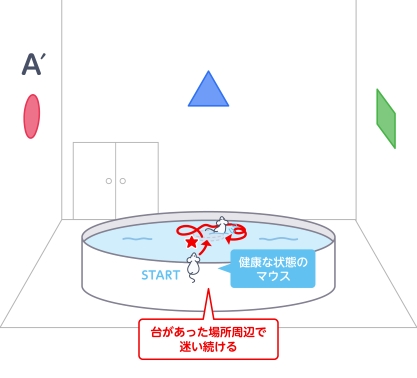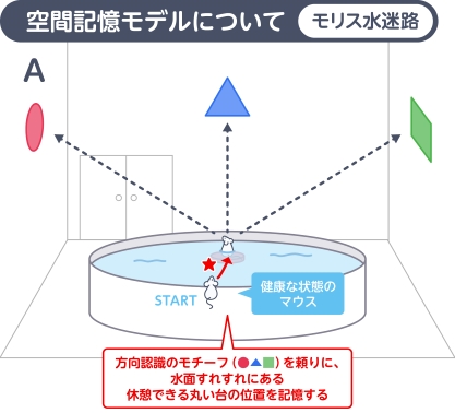 実験ではプールに丸い台を置き、マウスをさまざまな場所からプールに入れます。マウスは泳いでいる途中で「ここに台がある」と分かると、台に上がって休みます。この休憩が報酬となり、次から台を目指す動機になります。これを何日か繰り返すと、マウスは学習記憶によりおおよその位置を覚え、目的の台までどんどん早くたどり着けるようになります。