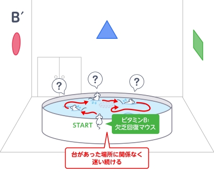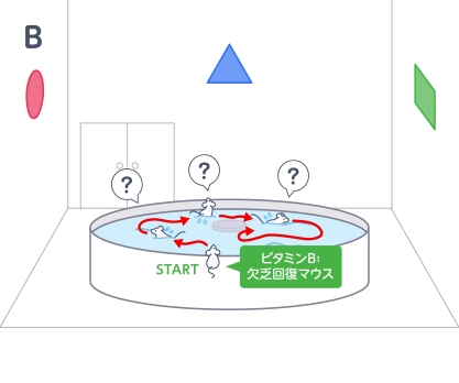 ビタミンB1欠乏回復マウスは、丸い台にたどりつくまでのルートを記憶できず、何度遊泳させても台にたどりつけない。また、繰り返し泳がせても到着に要する時間は短縮されない。