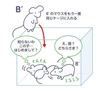実験では、大人のマウスと子供のマウスを同じケージに入れ、大人のマウスが子供のマウスのにおいをかぐ時間を測定します。大人のマウスは、相手がどんなマウスかを確認するためににおいをかぐ行動をとるのです。