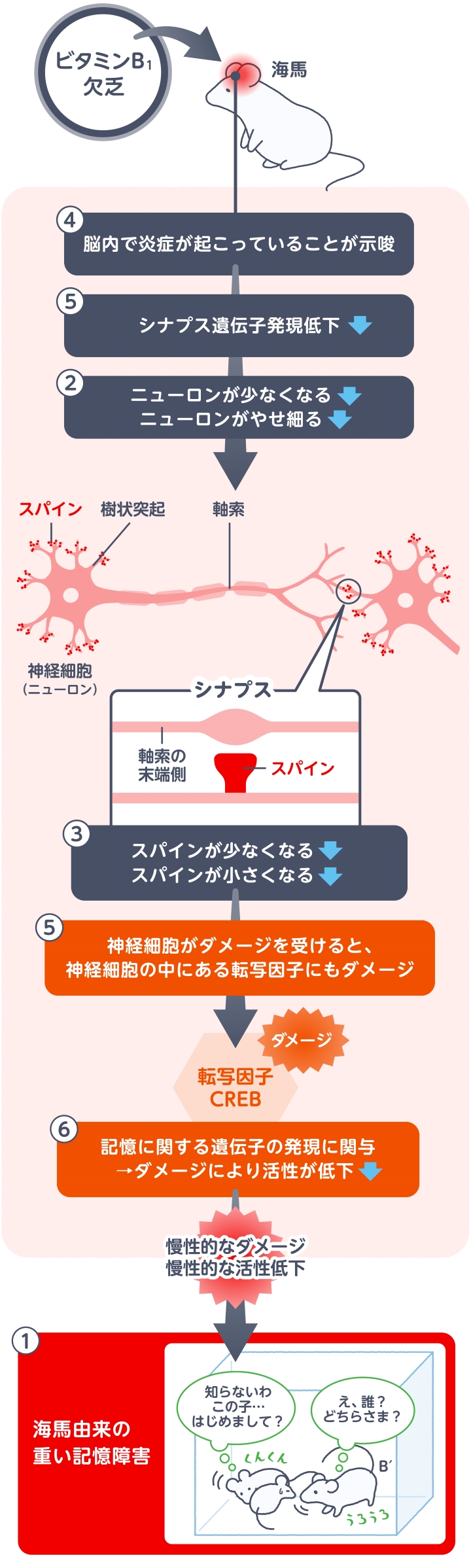 最終的には、ビタミンB1欠乏回復マウスのRNA解析から、記憶形成に重要な転写因子であるCREB(cAMP response element binding protein)の活性が低下していることも分かりました(➅)。つまり、ビタミンB1欠乏によって海馬に脳内炎症が生じ、海馬の神経変性を経て、最終的にCREBの働きに障害が残ります。CREBの働きは記憶の形成に欠かせない遺伝子発現に関わるため、CREBの活性低下により記憶障害が引き起こされるのだと考えられます。