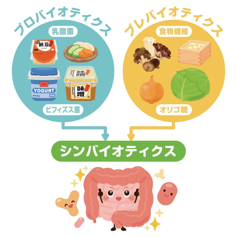 この、発酵食品などのプロバイオティクスとそのエサとなる食物繊維などのプレバイオティクスの両方を取り入れていくことを、「シンバイオティクス」といい、効率的に腸内細菌を増やしていく方法として注目を集めています。