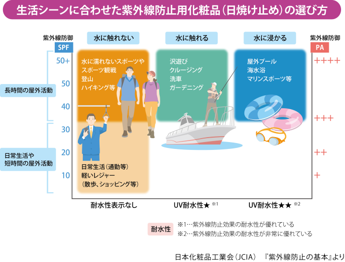 日焼けを防ぐためには「SPF値が高く、PAの数が多い日焼け止めを使うことが最善」と思われがちですが、実際には、紫外線を防ぐ力が強ければ強いほど肌に負担がかかるため、状況に合わせた適切な強さの日焼け止めを使い分ける必要があります。グラフを参考に、生活シーンに合わせた日焼け止めを選んでみてください。