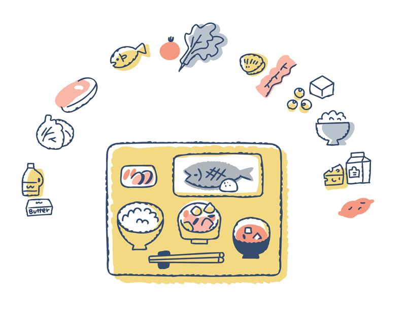 栄養バランスを整えるには、主食・主菜・副菜のそろった食事を中心に、乳製品や果物などの食品も取るように心がけることが基本です。特定の食品やメニューに偏った食事は避け、なるべく多種多様な食品を取り入れましょう。