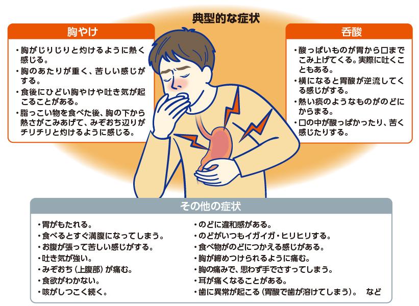 本来はしっかりと締まっているはずのつなぎ目がゆるんでしまうと、胃の中にある食べ物の一部や胃液が食道に逆流してしまうことがあります。ところが、食道の粘膜は、胃液に含まれる強い酸(胃酸)に耐える力がありません。そのため、逆流が繰り返されることで粘膜に炎症が生じ、胸やけなどの不快な症状につながってしまうのです。これが「GERD」という病気です。代表的な症状としては、「胸やけ」や「酸っぱいものがのどまで上がってくる感じ(呑酸)」、「逆流感」などがよく知られています。