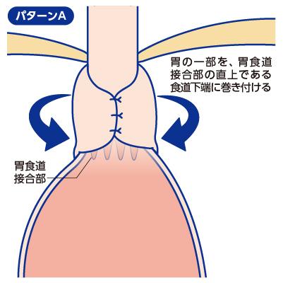 食道の出口に胃の一部を巻きつけて「一方弁」を作ることにより逆流防止のしくみを作ります。これは、Vol.1でご紹介した「普段はしっかり締まり、食べ物が通るときに一時的に開く“蓋”のはたらき」を再び作り出す処置です。これにより、胃からの逆流はほぼ完全に防がれるようになります。