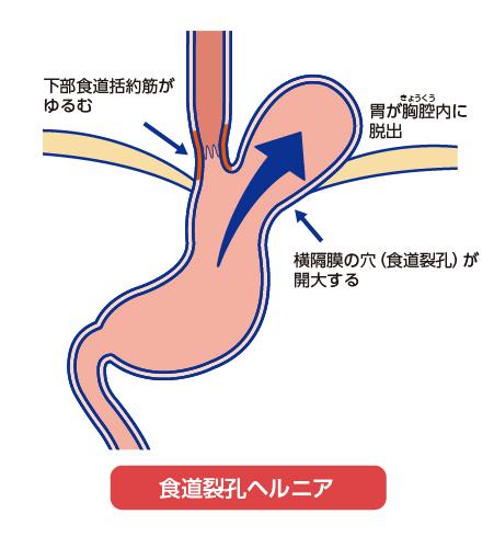 ※図の食道裂孔ヘルニアのパターンは一例です。この他いくつかのパターンがあります。