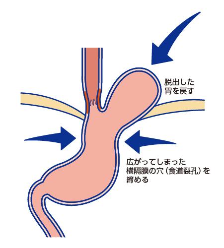 先ほどご紹介した「食道裂孔ヘルニア」に対する手術では、主に次の2つの処置を行います。