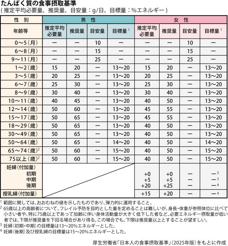 「たんぱく質」として、1日で摂取を推奨されている量は、18歳以上の健康な成人女性で50g、成人男性で65g(65歳以上の男性は60g)です。妊娠中の人は、中期で+5g、後期で+25g、また授乳中の人は+20g多く摂取することが推奨されています。