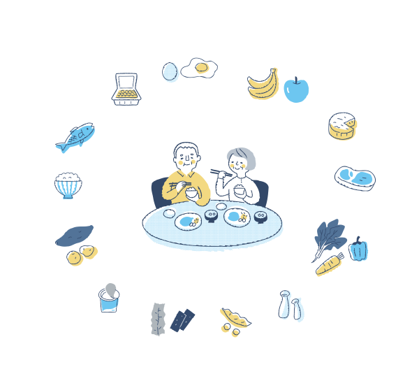 高齢期になると動物性食品由来のたんぱく質が脂っぽい、噛みにくいなどの理由で敬遠されがちに。しかし体内で効率良くたんぱく質を利用するためには、さまざまな種類のたんぱく質をバランス良く摂取することが大切です。大豆などの植物性のたんぱく質に加えて、肉類、魚介類、乳製品、卵類などもうまく組み合わせて食べるようにしましょう。