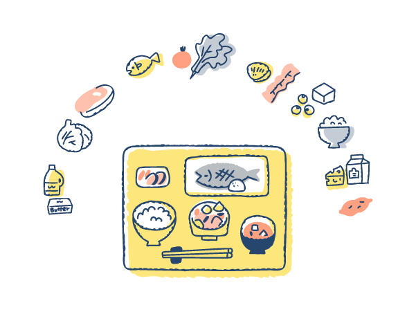 ・食生活は、主食、主菜、副菜を基本に、食事のバランスを。