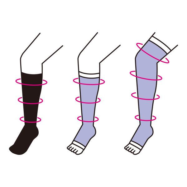 ふくらはぎのむくみに対しては、着圧タイツ(ストッキング)が有効とされています。通常のタイツよりも弾性を強くしたもので、ふくらはぎの持つ第二の心臓としての機能を高めるように機能します。サイズの他に、弾性の強いタイプ/弱いタイプ、膝までのタイプ/太ももまで覆うタイプなどの違いがあります。弾性が強いと睡眠が邪魔されることもあるので、自分にあったタイプを選んで使いましょう。