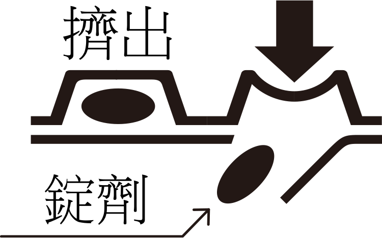 如圖所示,指尖用力按壓裝有錠劑的PTP膜的泡罩,擠破背面的鋁箔,取出錠劑服用。(如誤將其直接吞服,則可能會發生刺傷食道粘膜等意外事故。)