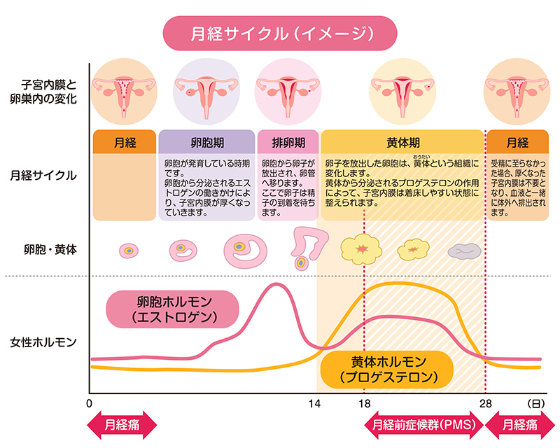 月経の3~10日ほど前から始まり、月経が始まると自然に落ち着いていく心身の不調を「月経前症候群(PMS)」といいます。