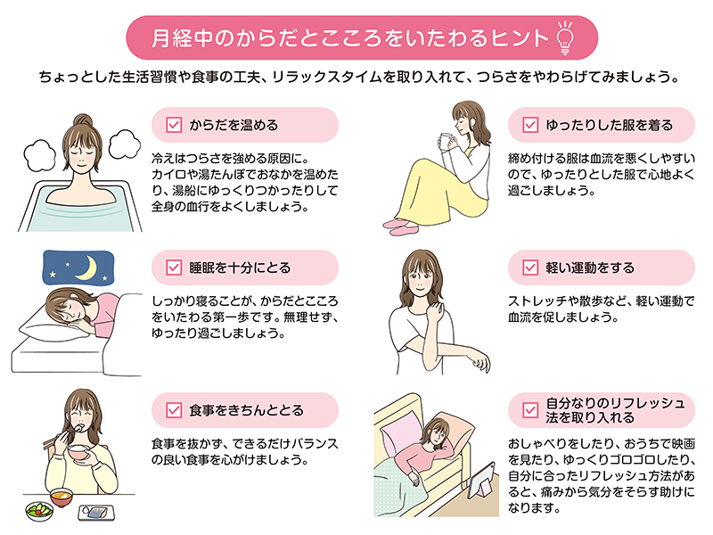 身体を温めたり、ほっとできる時間をつくったり、必要に応じて鎮痛剤を使うなど、心地よく過ごせる工夫を少しずつ取り入れてみてください。