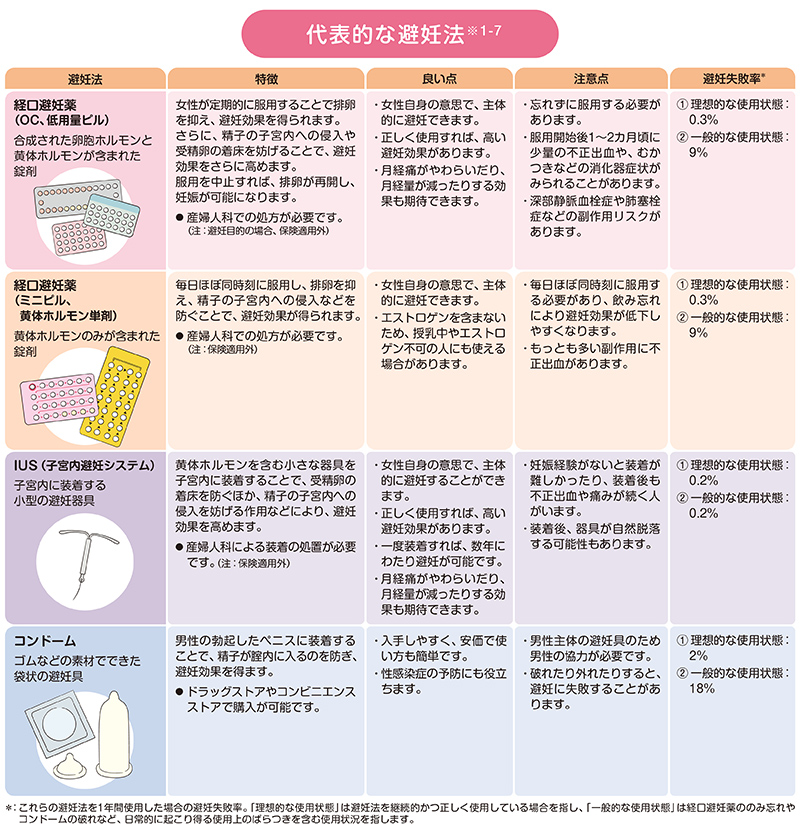 避妊にはさまざまな方法があり、それぞれに特徴があります。どの避妊法も妊娠を100%防げるわけではありません。避妊の効果をより高めるために、コンドームとピルを併用するなど、複数の方法を組み合わせるという選択肢もあります。