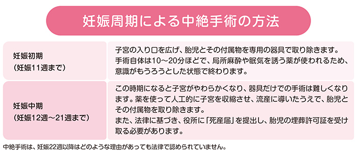 中絶手術は、妊娠11週までの初期と、12週以降の中期とで方法が異なります。